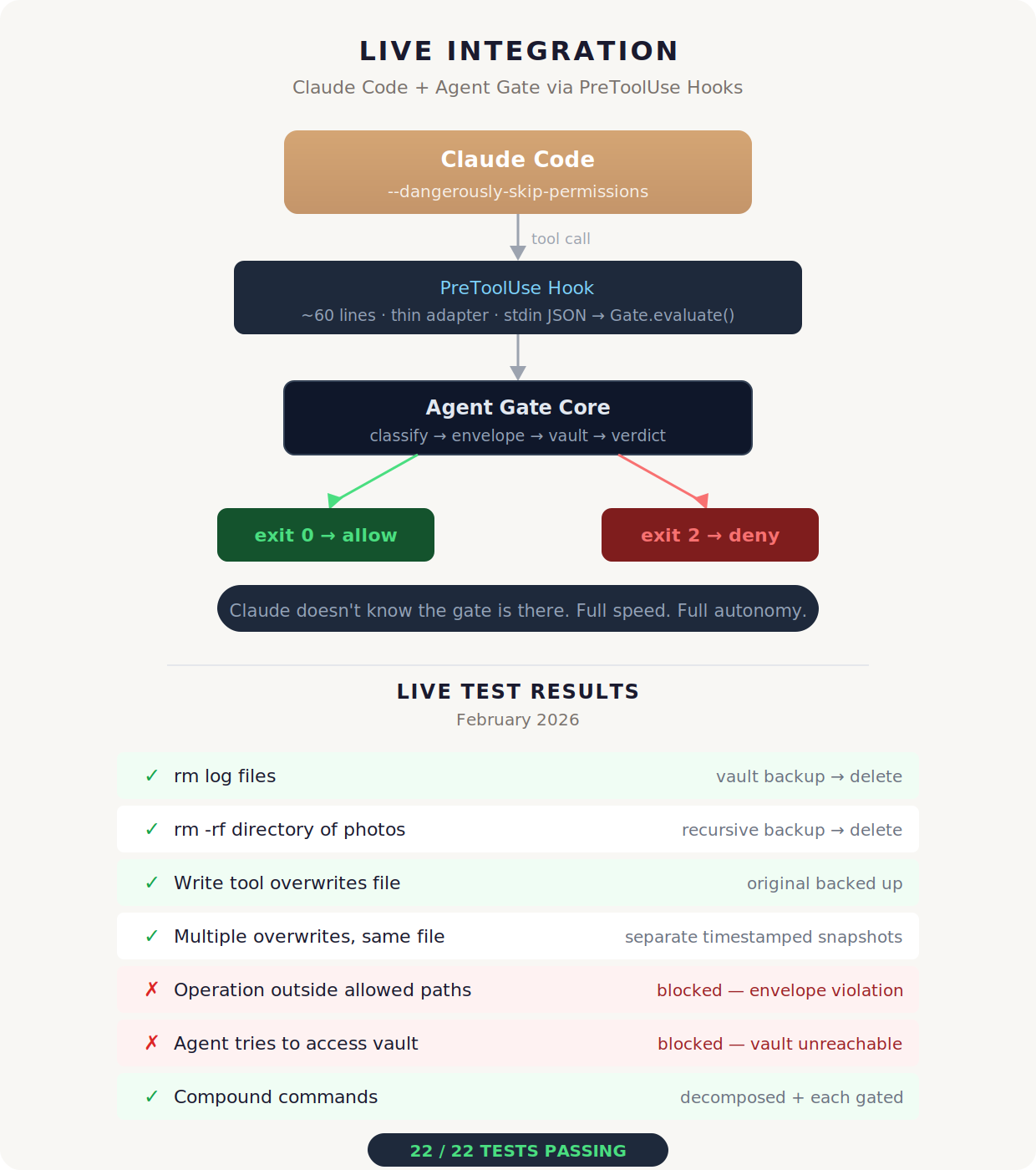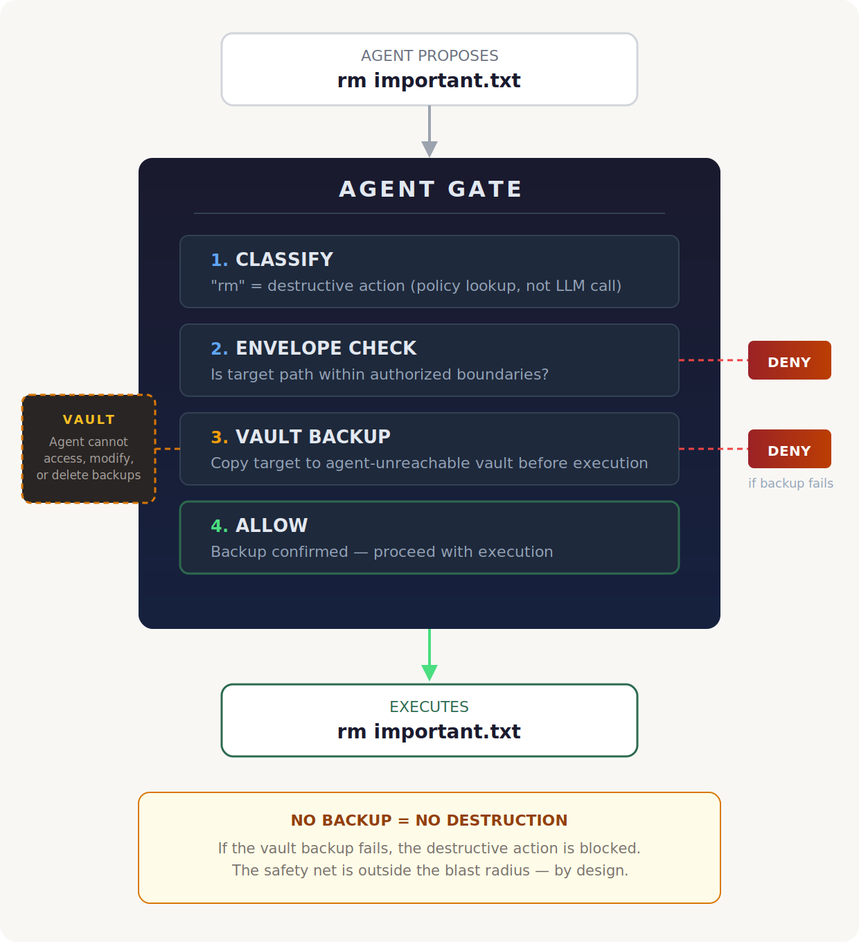 For destructive actions within the envelope, the gate copies every target file to a vault before execution. The vault lives outside the agent's permitted directories. The same gate that enforces the envelope protects the vault, the agent cannot access, modify, or delete its own backups.