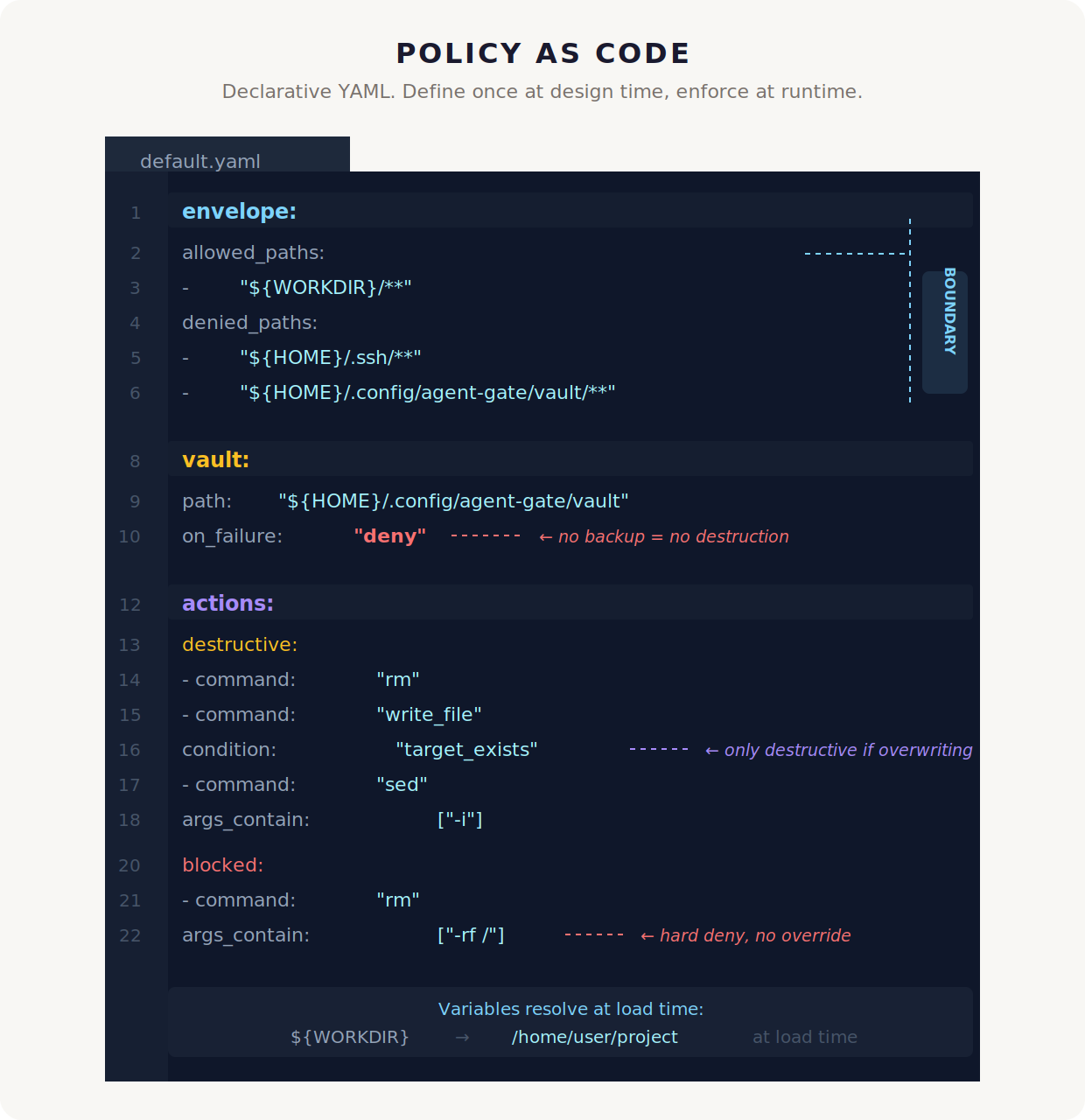 The entire authority model is a single YAML file. You define the rules once at design time, which directories the agent can touch, what commands trigger a backup, what commands are prohibited outright, and the gate enforces them at runtime without any further configuration.