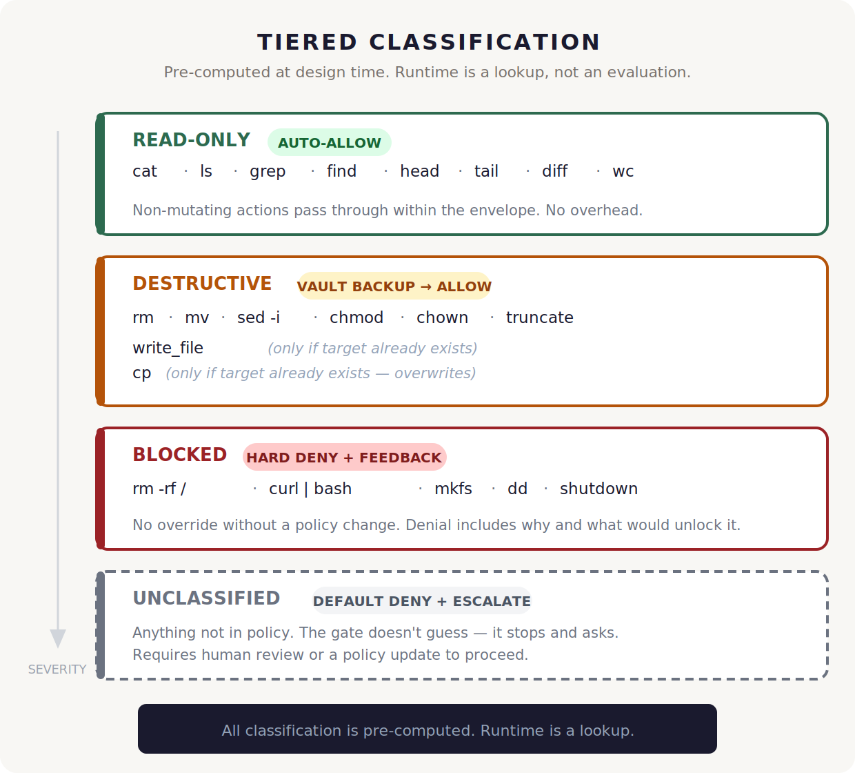 Every action an agent can propose maps to one of four tiers, and the mapping is defined at design time, not evaluated at runtime. When the gate sees a tool call, it matches the command against policy. The classification is a lookup table, not a judgment call.